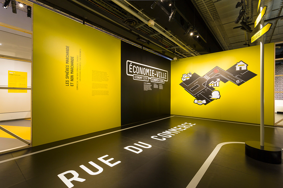 Le "cœur" de l'exposition habite une petite cité abstraite, esquissée offre ainsi un condensé des usages de l’économie au quotidien et apporte un complément de contextualisation aux manipulations et dispositifs ludo-pédagogiques.